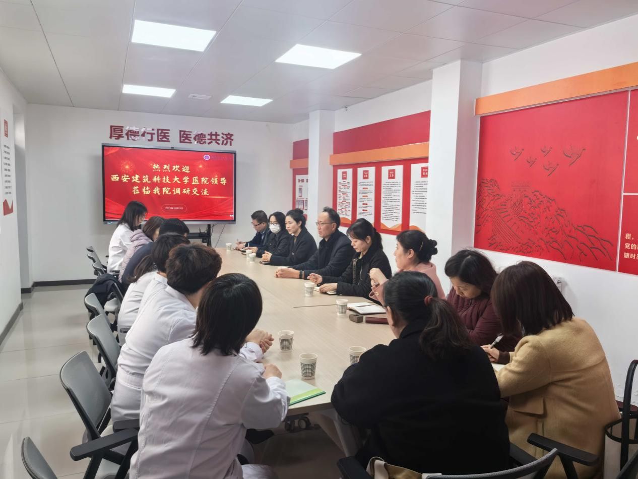 11 月 13 日,西安建筑科技大学医院院长刘卫东带领医院骨干团队一行九人莅临我院,开展以信息化建设、医院建设改造为核心的调研交流活动。我院院长薛红争、副院长冯丽娟、陈洁及各临床科室主任参加调研。